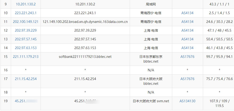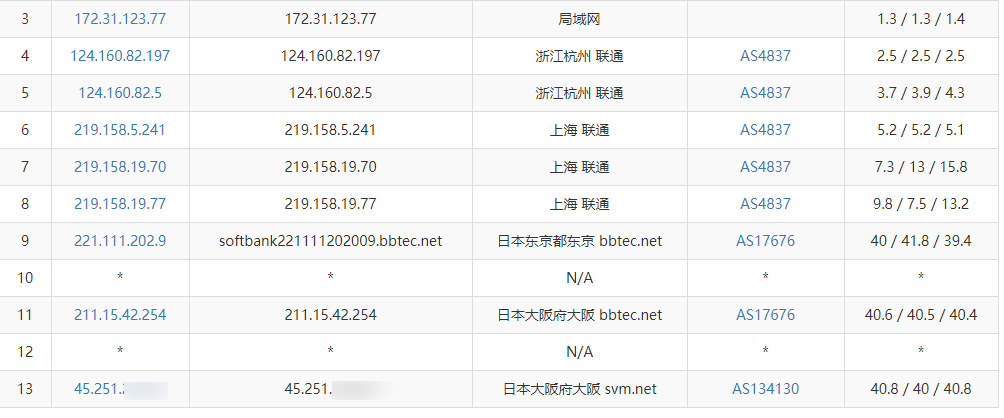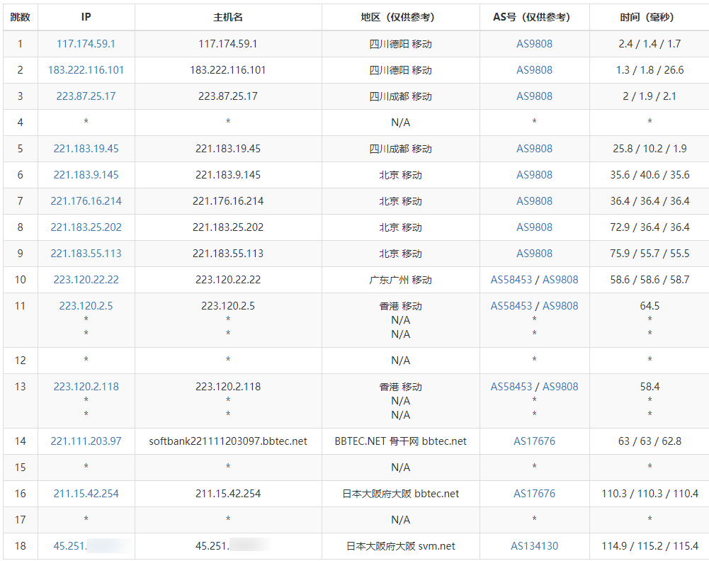 Tianjin (Unicom): Exits via Shanghai backbone network, direct route to Japan.