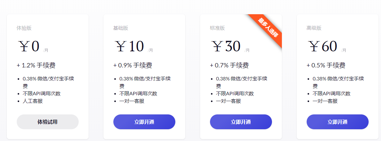 XorPay charges a 0.38% handling fee for WeChat/Alipay transactions, which is collected by the Alipay and WeChat official channels. Additionally, depending on the XorPay package you choose, extra handling fees may apply. Relatively speaking, the fees are a bit high. The official pricing is as follows.