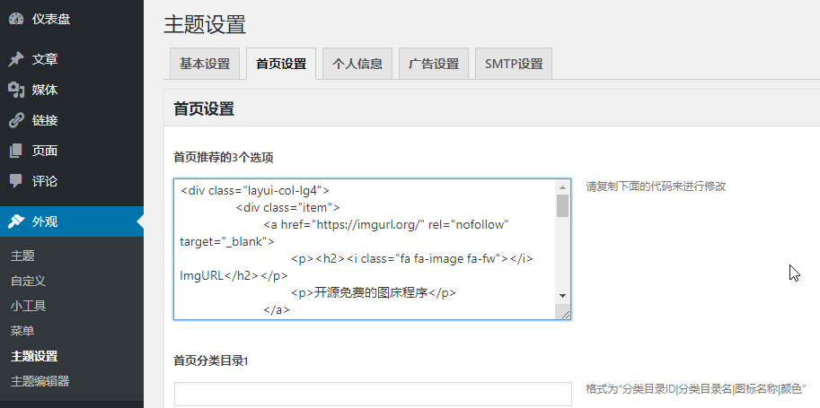 Open the WordPress admin dashboard, navigate to Appearance > Theme Settings, and you will see the Msimple "Homepage Settings" as shown below.