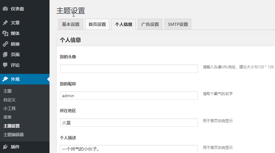 Navigate to the WordPress dashboard, then go to Appearance > Theme Settings to access the Msimple "Personal Information" section, as shown below.