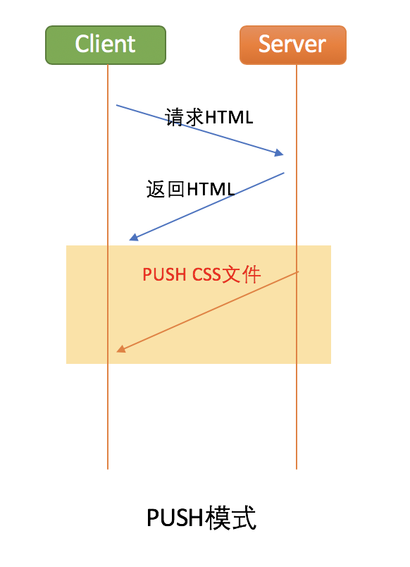 In Server Push mode, when requesting an HTML file, if the HTML contains CSS files, the server pushes them to the client simultaneously. The following image shows the HTTP/2.0 transmission process.