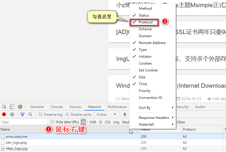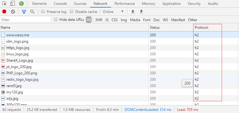 After refreshing, you will see the "Protocol" column display "h2", indicating that HTTP/2 features are supported.