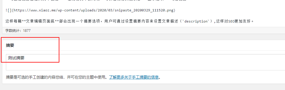 This will add an Excerpt option at the bottom of each article editing page. Users can set the article description (description) by configuring the excerpt content. If no excerpt is set, the first 200 characters of the article will be automatically used as the description, which is more friendly for SEO.