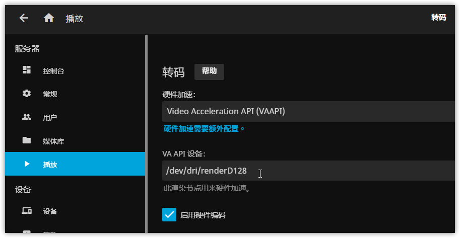 Open the Jellyfin Console, navigate to Server > Playback, and enable hardware acceleration following the settings shown below.