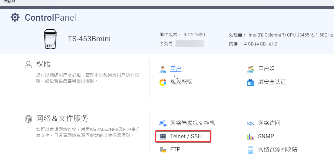 To facilitate modifying Docker configuration files, we need to enable SSH login first. Open the QTS Control Panel, go to Network & File Services, find Telnet/SSH, and enable the SSH service according to the page prompts. After enabling, log in using the QTS administrator account and password.