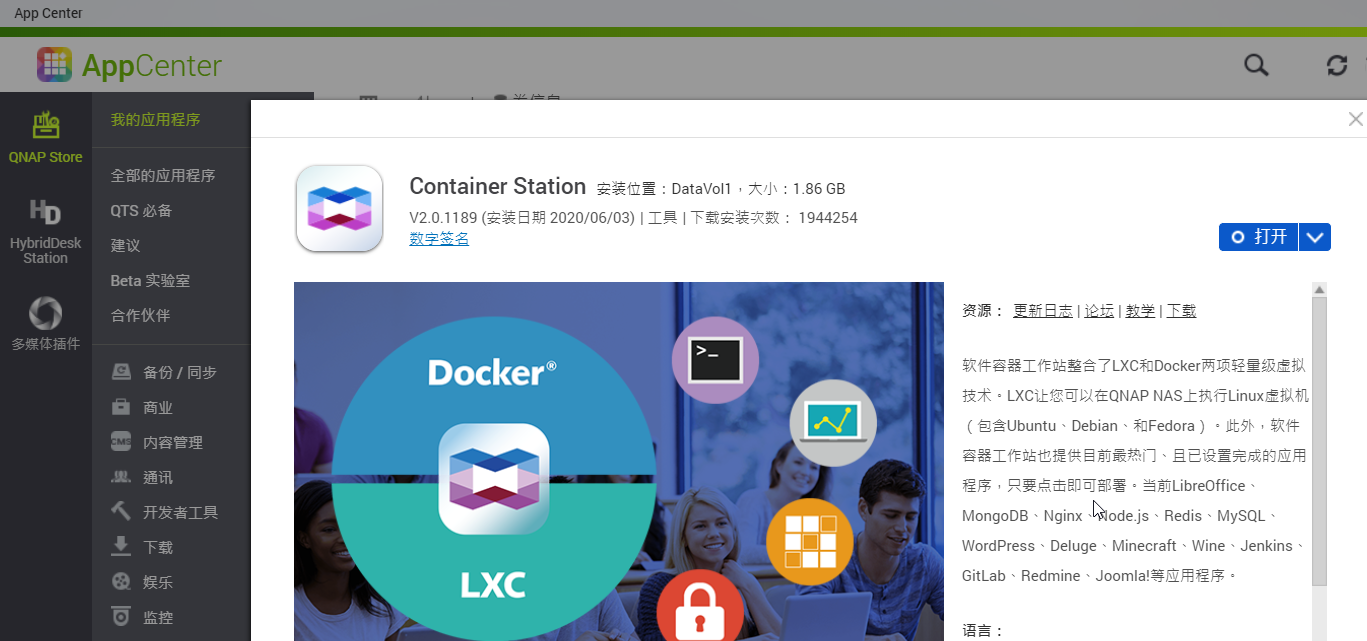 In the QTS system, the Docker container software is called "Container Station." Simply open the AppCenter, search for the software, and install it, as shown below.