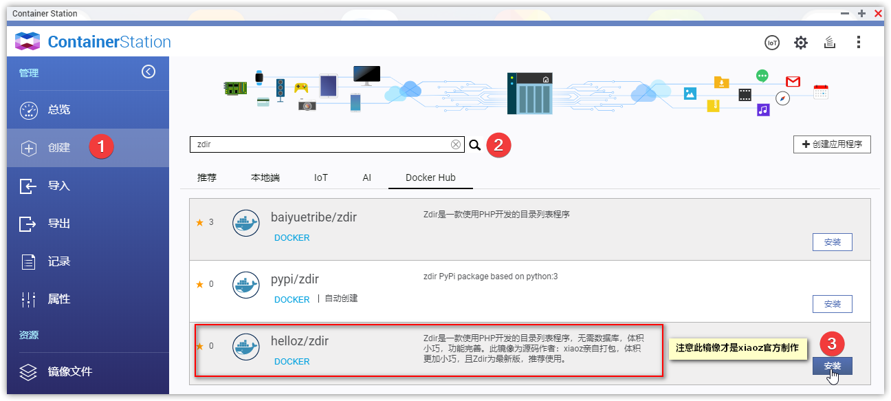 Open the Container Station suite (Docker) in QTS, click the Create button, and search for Zdir. Find and install the Docker image provided by the xiaoz official account. Note: You must use the Docker image provided by xiaoz official; otherwise, the latest version of Zdir will not be supported.