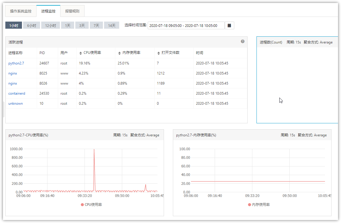 It also supports process-level monitoring, which is excellent. If you want to implement process monitoring with Zabbix, you would need to write various scripts and configurations, which is very troublesome. Aliyun Cloud Monitor integrates this feature directly.