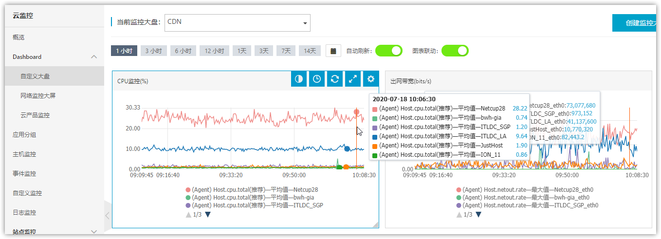 When managing a large number of servers, checking individual servers one by one is inconvenient and hinders data comparison. Aliyun Cloud Monitor allows you to create custom monitoring dashboards. You can add servers with the same purpose to a dashboard group to view aggregated data for multiple servers.