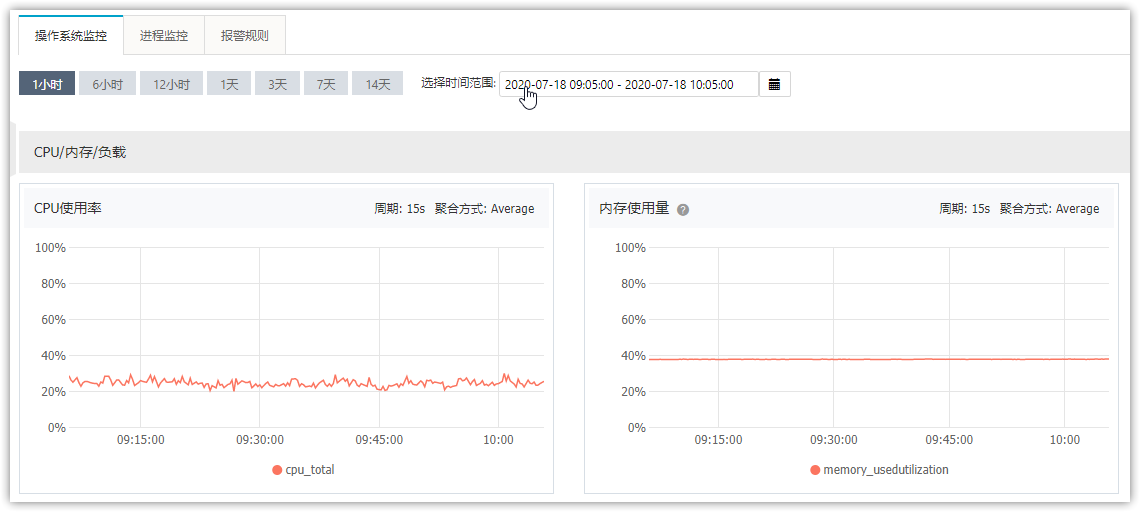 Key monitoring metrics are collected once per second, and all metrics are reported every 15 seconds. This means the minimum time interval between data points in the monitoring graph is 15 seconds. Generally, you can view server monitoring data a few minutes after installation. CPU, memory, bandwidth, and other usage statistics are clearly visible.