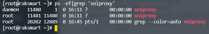 Finally, enter the command sniproxy to start it. You can input ps -ef|grep 'sniproxy' to check if the process has started. Note: You also need to allow the listening port in the firewall.