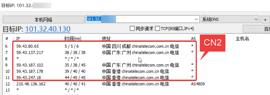 For Sichuan Telecom, the outbound route goes through the Guangdong exit, directly connecting to Hong Kong, showing the CN2 line as seen below.