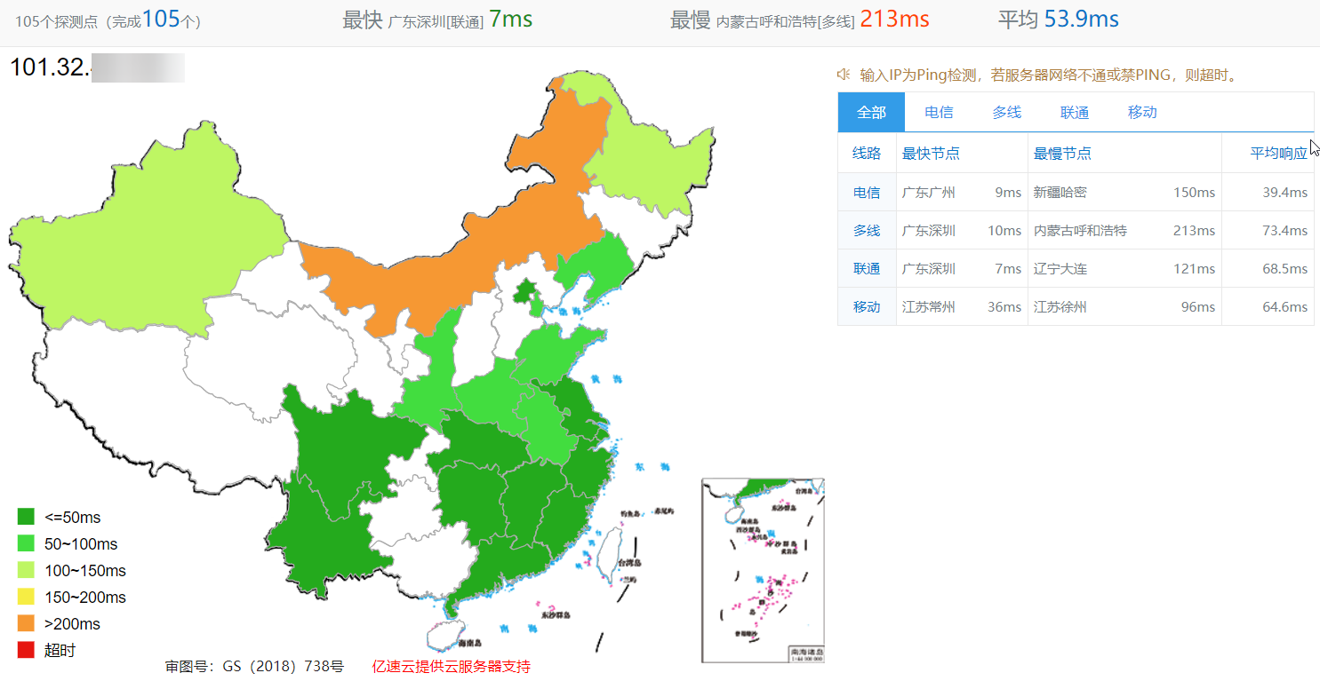 Super Ping testing showed an average latency of 53.9ms (domestic), comparable to domestic servers.