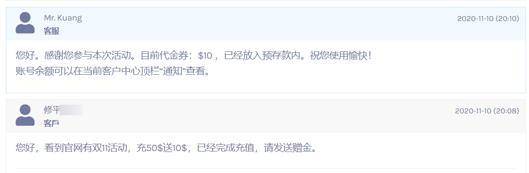 After completing the deposit, you need to submit a ticket to contact customer service for the bonus credit. Ticket processing during working hours is quite fast. Xiaoz has already deposited $50 and is waiting for the Double 11 40% discount.