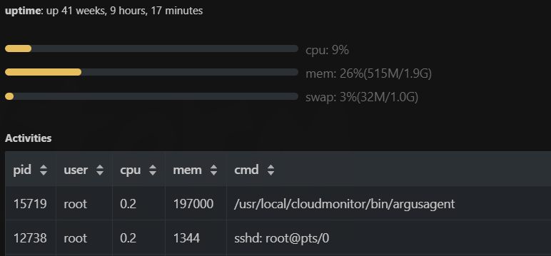 Click the Terminal info in the bottom right corner to view server CPU, memory, network, and other information.