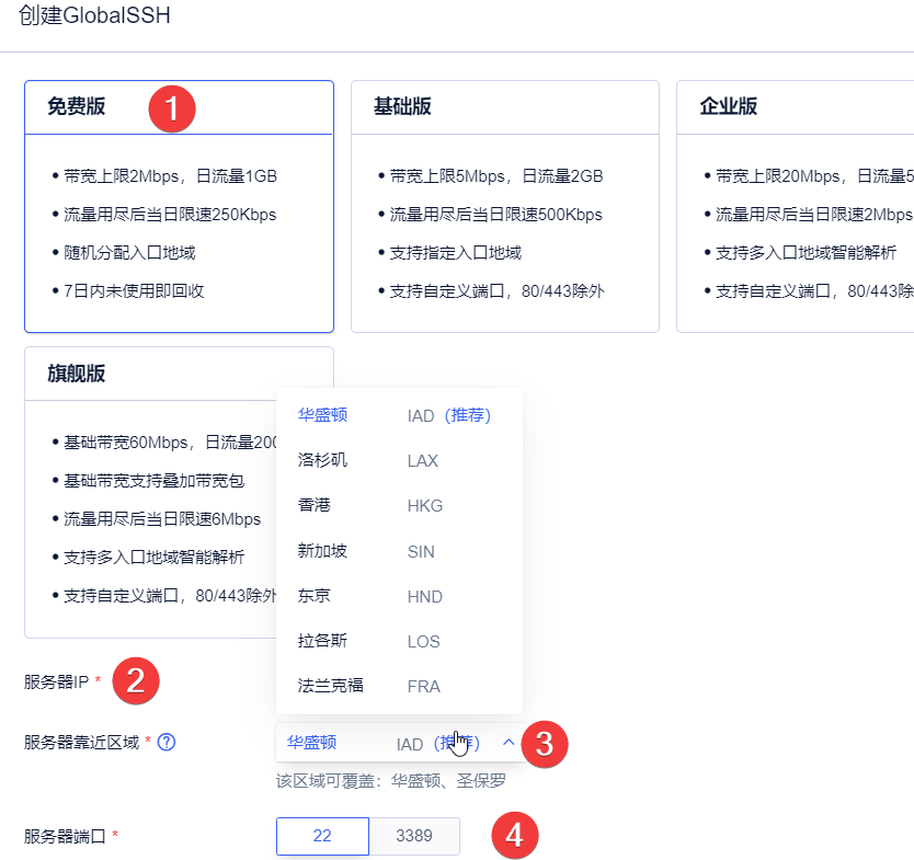 Select the free plan, fill in the server IP, and choose the region closest to your server (e.g., Frankfurt for a European server). The port only supports 22/3389; select port 22 for Linux servers and port 3389 for Windows servers.