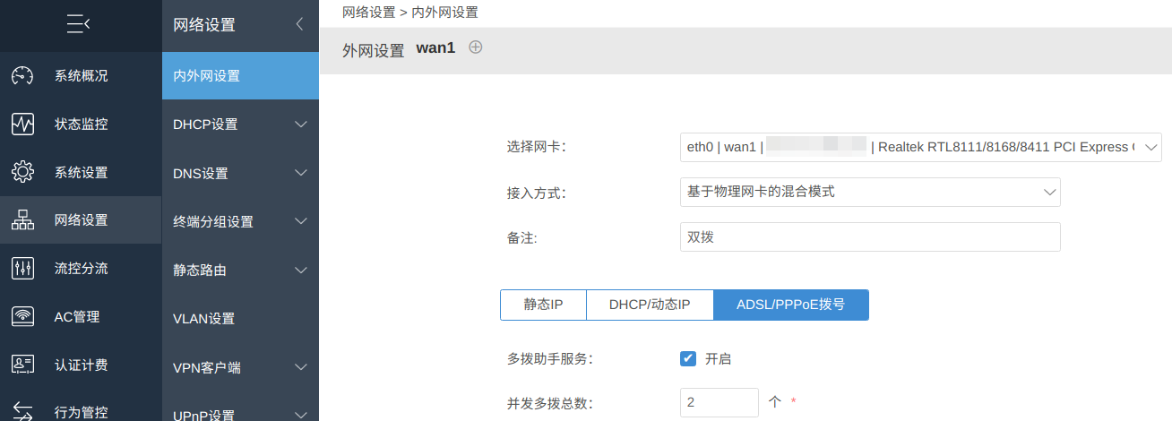 Currently, testing shows that Chengdu Telecom supports 3-way dialing. You can configure this under Network Settings > Internal/External Network Settings > Mixed Mode Based on Physical NIC > ADSL/PPPoE Dialing, as shown below.