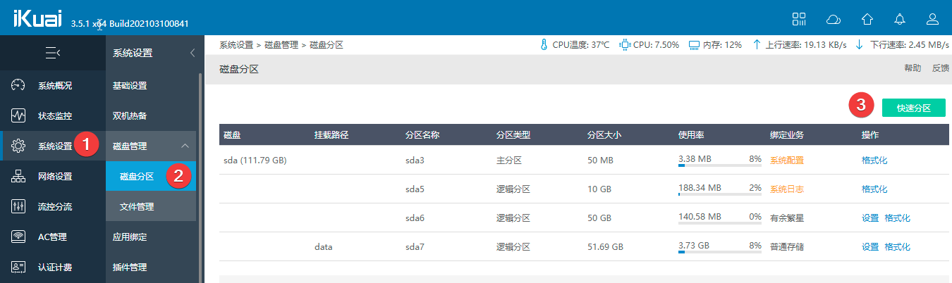 After installation, there are only two partitions: a system partition and a log partition. You can perform quick partitioning in the backend under System Settings > Disk Management > Disk Partition. Quick partitioning will not affect the system.