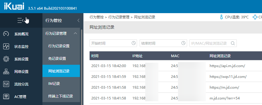 iKuai OS supports behavior record management, which needs to be enabled manually in the backend. Once enabled, you can view browsing records and IM online/offline records of devices, as shown below.