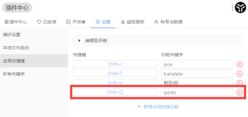 If you wish to further improve efficiency, you can also add IPinfo to global shortcuts in "Settings - Global Shortcuts". For example, xiaoz has set Shift + Q as the keyword "ipinfo", allowing you to use IPinfo directly by pressing Shift + Q next time.