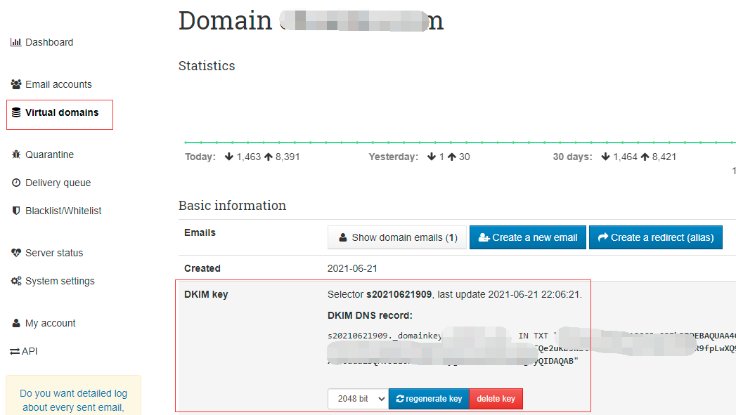 In the Poste.io backend, go to Virtual domains, click the corresponding domain, select DKIM key, create a key, and set up the TXT record resolution as required.