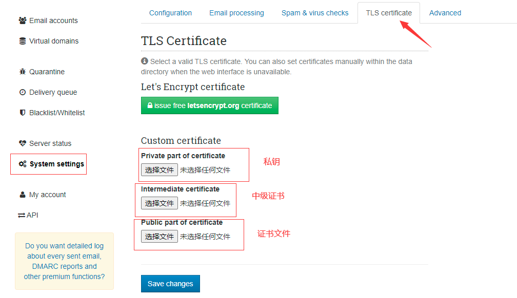 After obtaining the SSL certificate, open the Poste.io backend, go to System settings > TLS Certificate, and upload the certificate file as shown in the screenshot.