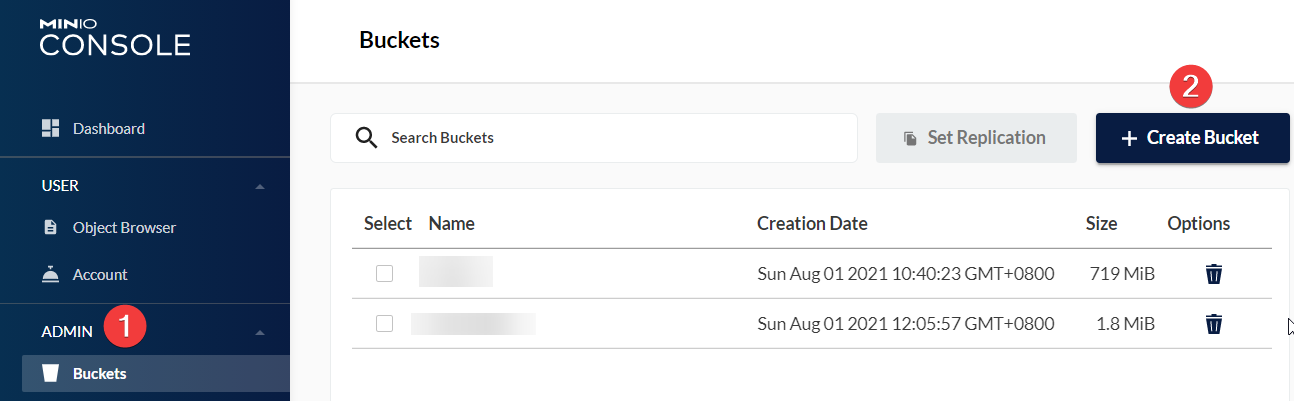 Users familiar with object storage know the concept of a "bucket" (translated from Chinese as "桶"). Objects (files) are stored inside these buckets. Click "Create Bucket" to create one.