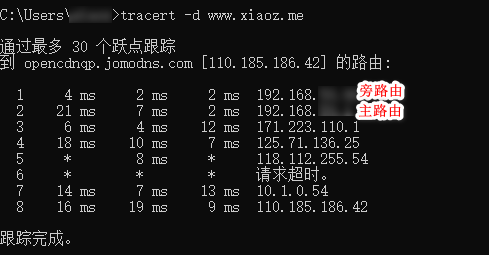 Verify on any device within the LAN (requires setting to DHCP automatic IP acquisition). Disconnect and reconnect the network to let the main router (iKuai) DHCP assign network configuration. Use the tracert command to trace the route. You will see the path goes: Side Router -> Main Router -> Backbone Network.
