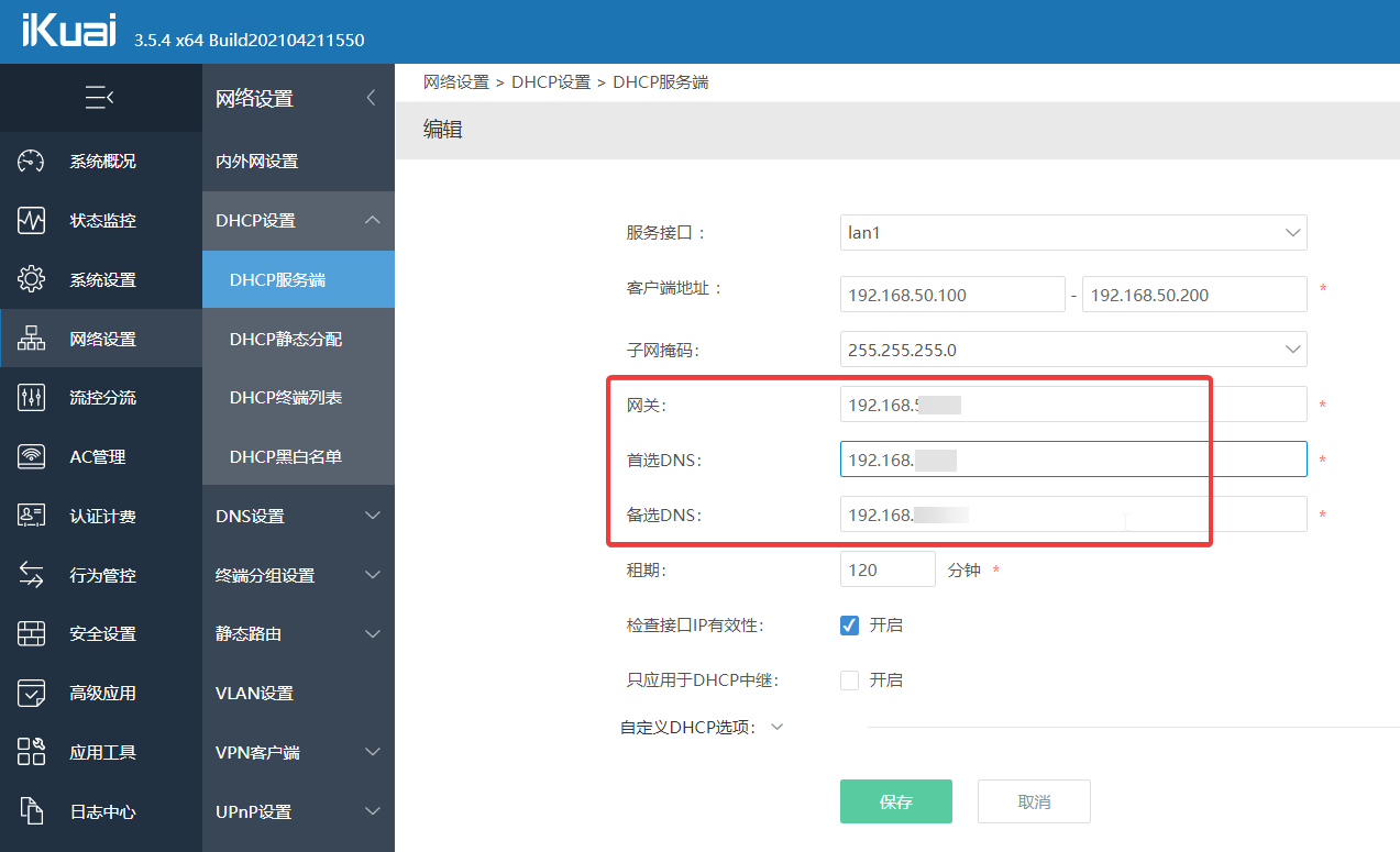 Open iKuai - Network Settings - DHCP Settings - DHCP Server - Set the Gateway and DNS to the LEDE IP address. This completes the iKuai configuration.