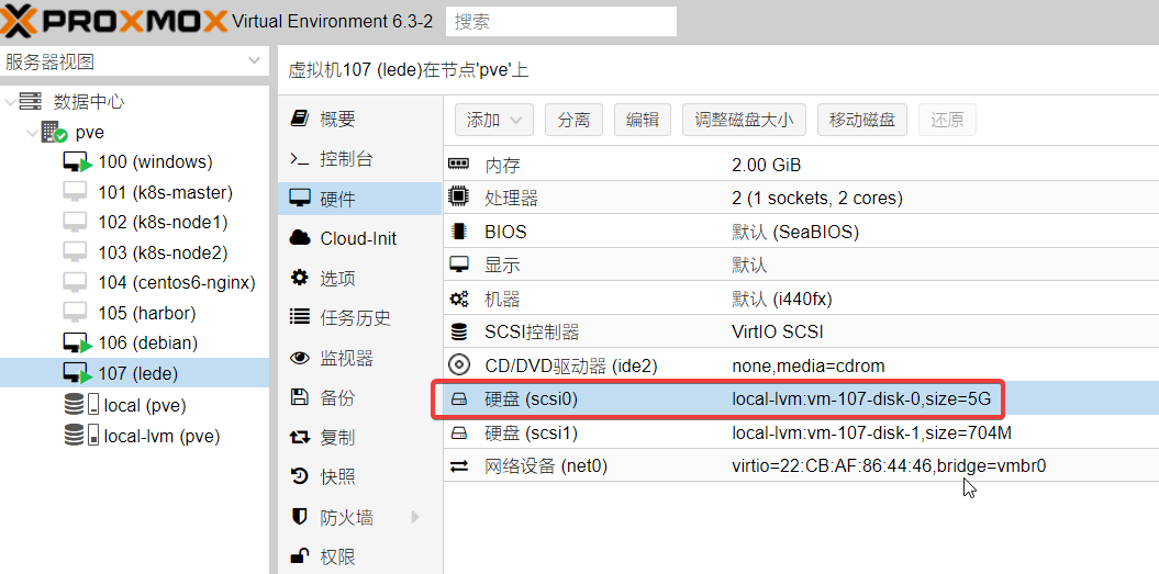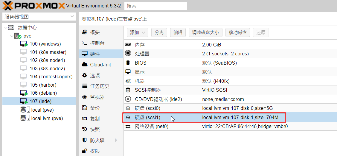 Create a blank Linux system in PVE and record the disk number. For xiaoz, this is 107.