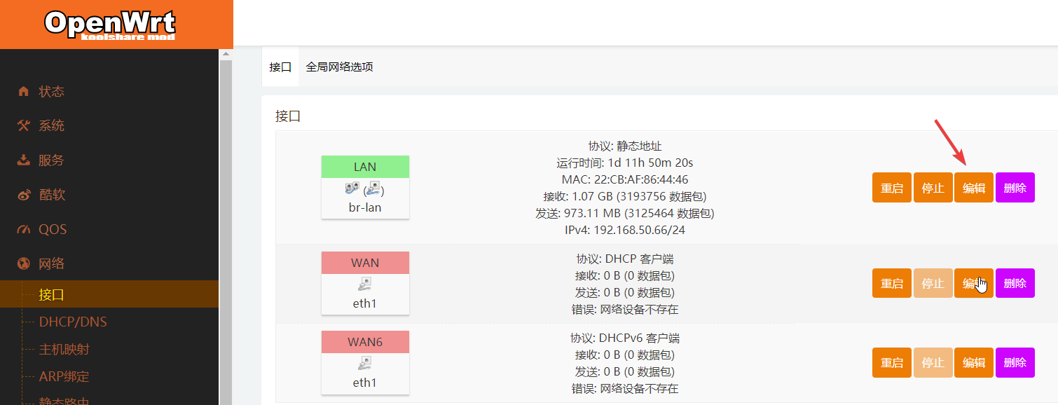 Here we use LEDE as a side router, requiring some configuration. Open Network - Interfaces - Find LAN to edit.