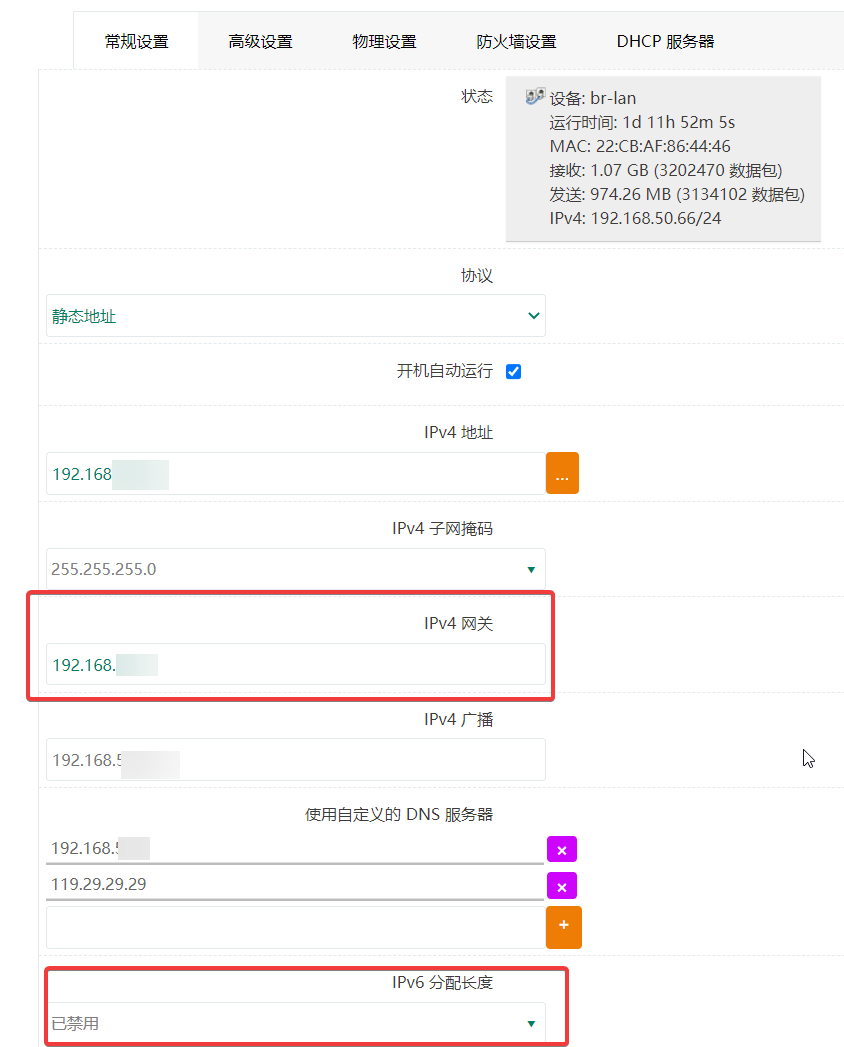 In the General Settings, set the IPv4 Gateway to the iKuai IP address, and disable IPv6 Allocation Length.