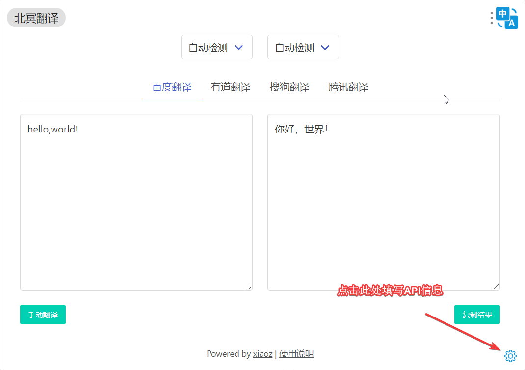 Open "Beiming Translation" and click the settings button in the bottom right corner to fill in the API information.