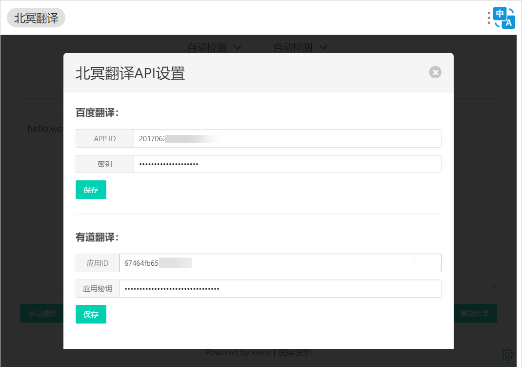 Currently, Baidu Translation and Youdao Translation are supported, requiring manual API configuration. Application links are as follows: