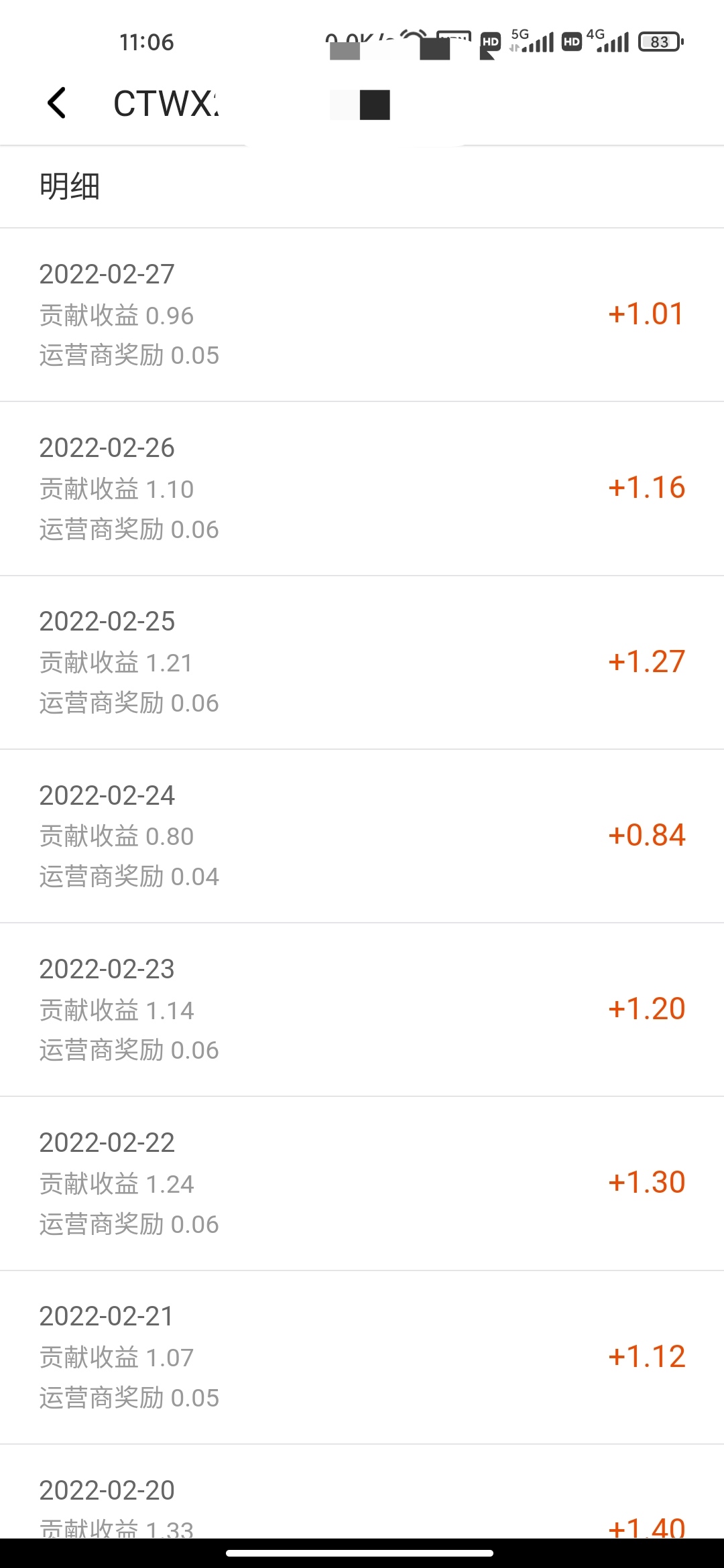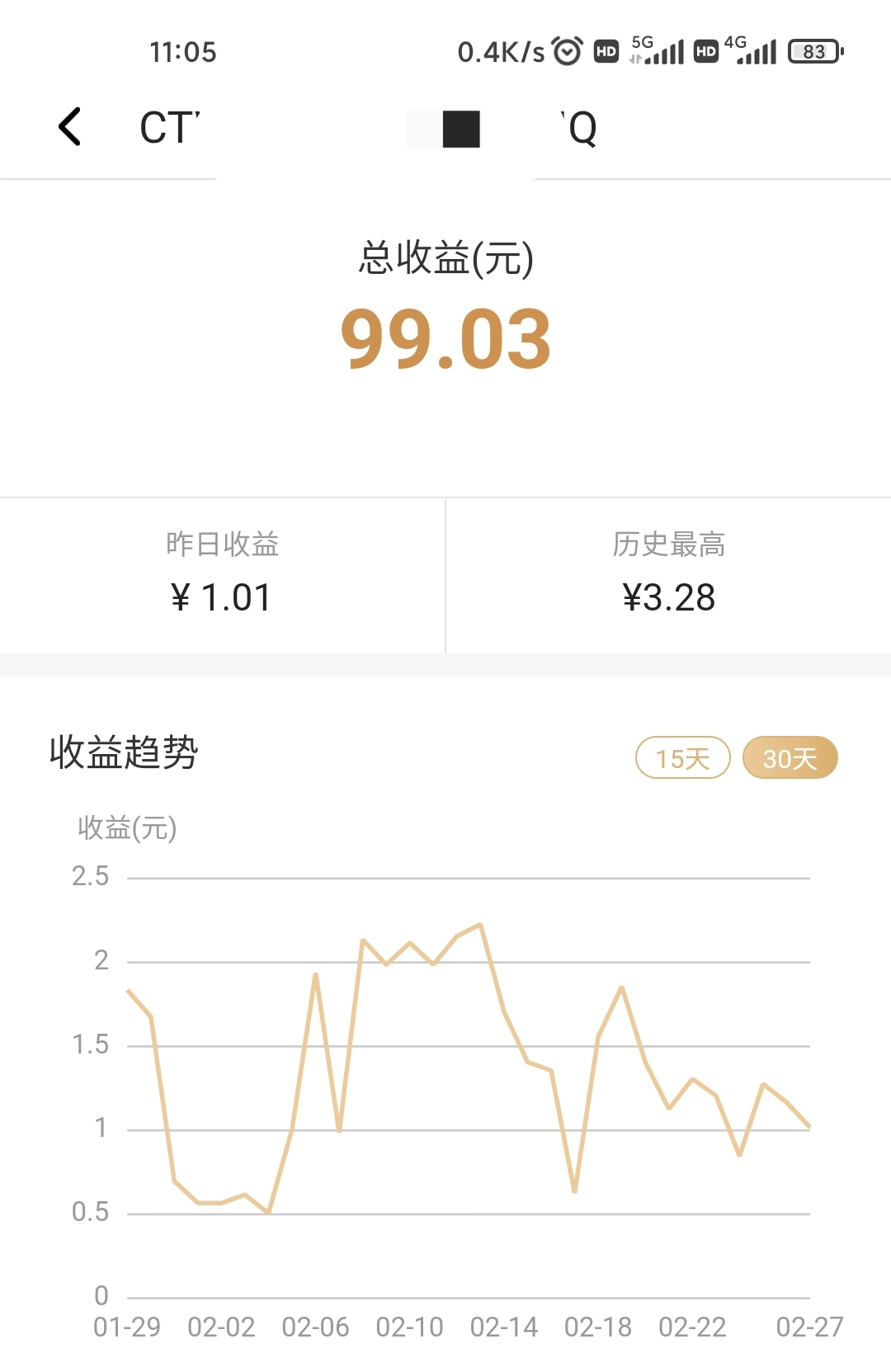 Currently, I have been hanging for 83 days with a total return of 99.03 CNY. The highest daily return was 3.28 CNY, and the average daily return is 1.19 CNY. Below are my screenshot data.
